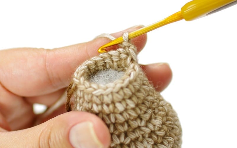 • Comenzar a rellenar la cabeza con fibra de poliéster. Seguir añadiendo un poco de relleno cada pocas vueltas.